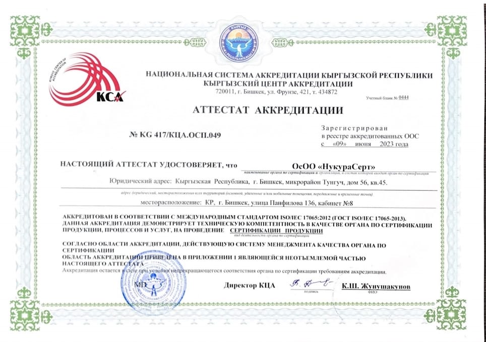 Аттестат аккредитации № KG 417/КЦА.ОСП.049 от 09 июня 2023 года года